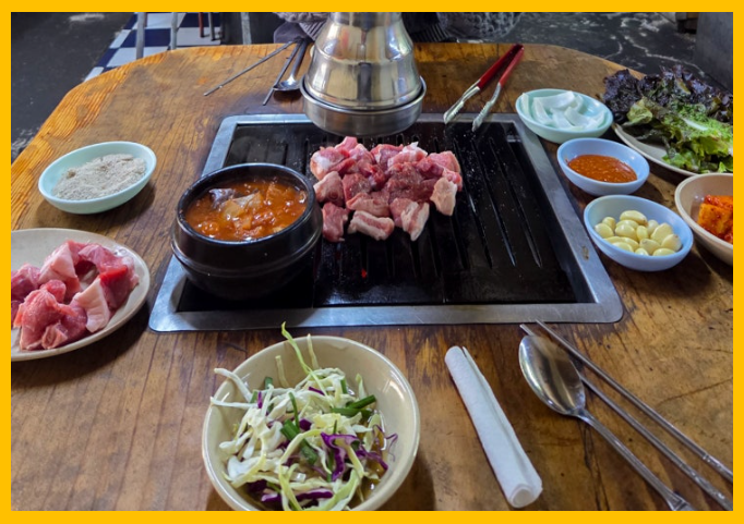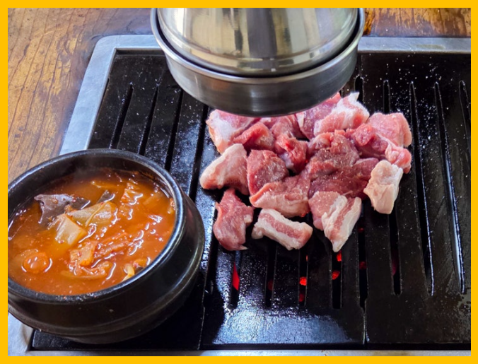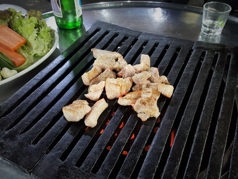 두툼하게 썰린 고기를 연탄불에 올리면, 겉은 바삭하게 구워지고 속은 육즙이 살아 있습니다.