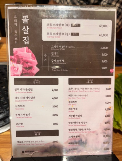 이 식당의 가장 큰 특징은 제주 흑돼지 특수부위 여섯 가지를 한 번에 맛볼 수 있는 ‘모둠 스페셜’ 구성입니다.