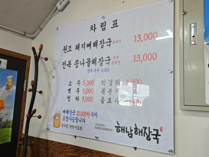 • 메뉴: 돼지뼈해장국 13,000원 / 전복 콩나물해장국 13,000원