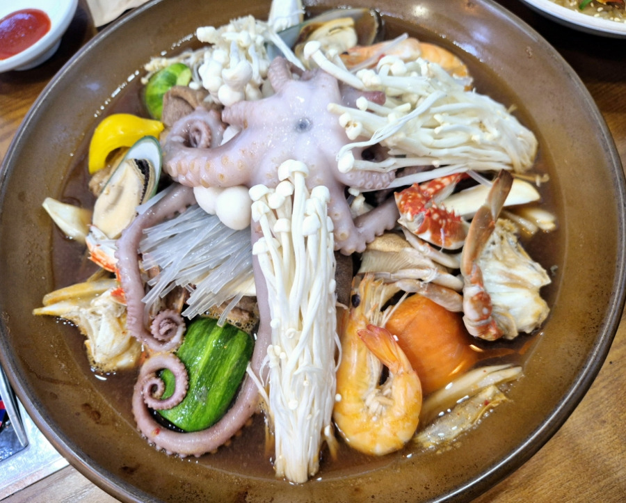 돼지갈비의 깊고 진한 풍미 위에 신선한 해물이 푸짐하게 올려져 있었고, 그 조합이 흔치 않음에도 서로의 맛을 완벽히 보완하며 깊은 감칠맛을 만들어냈습니다.
