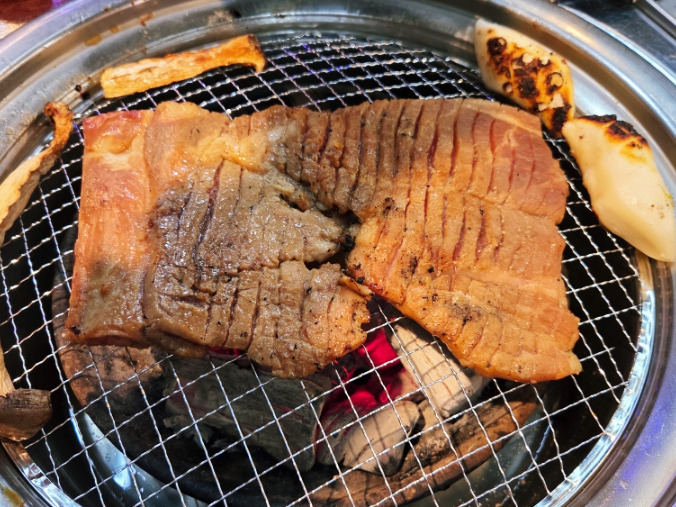강한 불에서 겉을 살짝 굽고 중간 불에서 천천히 익히는 방식이 가장 맛있게 즐기는 방법이라는 설명과 함께 직원이 직접 굽기를 도와주는 모습도 인상적이었습니다.