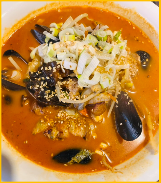 족살짬뽕은 첫 숟가락에서부터 진한 사골 풍미가 전해지는 국물이 특징이며, 신선한 해산물이 더해져 시원하고 얼큰한 맛을 완성합니다. 국물 위로 푸짐하게 올려지는 족살은 불향이 은은하게 배어 있어 한 그릇 안에서 풍미의 균형을 훌륭하게 잡아줍니다.