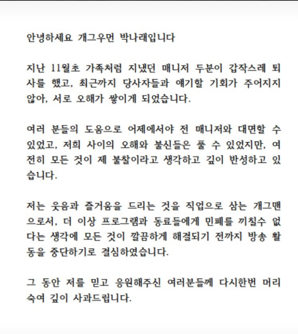 박나래는 “모든 것이 명확해지기 전까지 방송 활동을 중단하겠다”며 사과문을 올렸습니다.