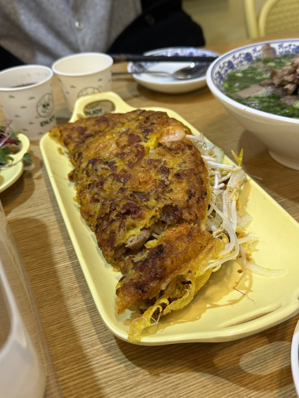 돼지고기와 숙주, 각종 채소가 들어 있는 반쎄오는 바삭함과 고소함을 동시에 느낄 수 있어 쌀국수와 함께 먹으면 더욱 풍성한 식사가 됩니다.