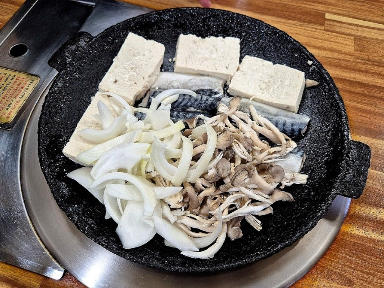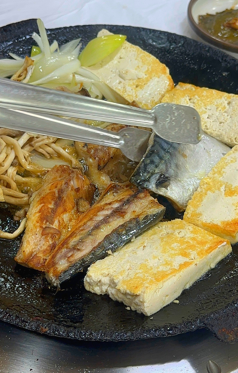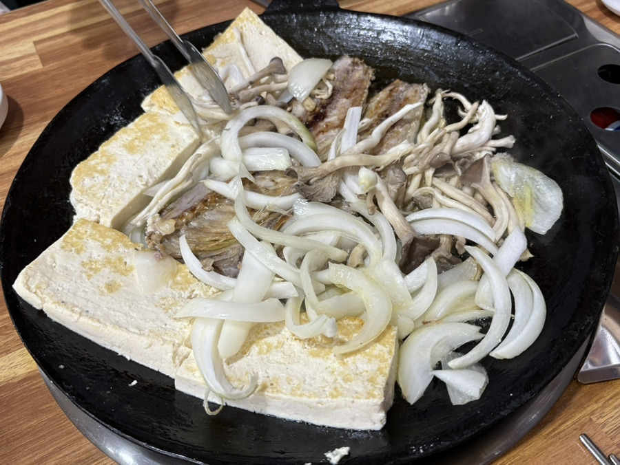 무쇠판 위에서 구워지고 있던 메뉴는 더더욱 놀라움을 자아냈습니다. 두툼한 촌두부와 고등어가 한 판에서 나란히 구워지고 있었고, 이 특별한 조합을 본 세 사람은 처음엔 어리둥절해하며 서로의 얼굴을 바라보았습니다.