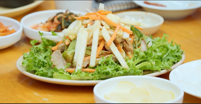 부드럽게 삶아낸 돼지고기 수육에 알싸한 겨자 양념과 신선한 채소를 더해 담백하면서도 개운한 맛을 자랑하는데, 평양냉면과의 궁합이 뛰어나 많은 단골들이 즐겨 찾는 메뉴입니다.