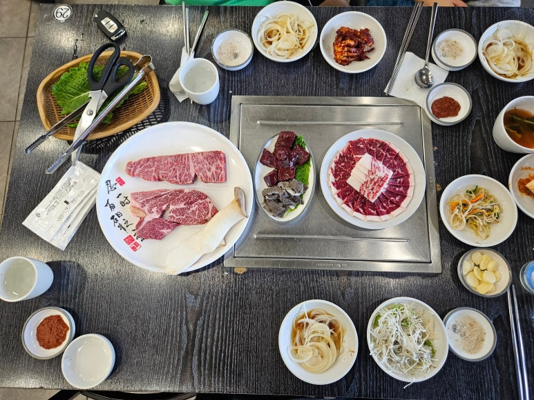 1층에서는 직접 흑우를 눈으로 확인하며 원하는 부위를 구매할 수 있고, 2층 식당으로 올라가 상차림 비용만 추가하면 숯불에 바로 구워 먹을 수 있는 구조입니다.