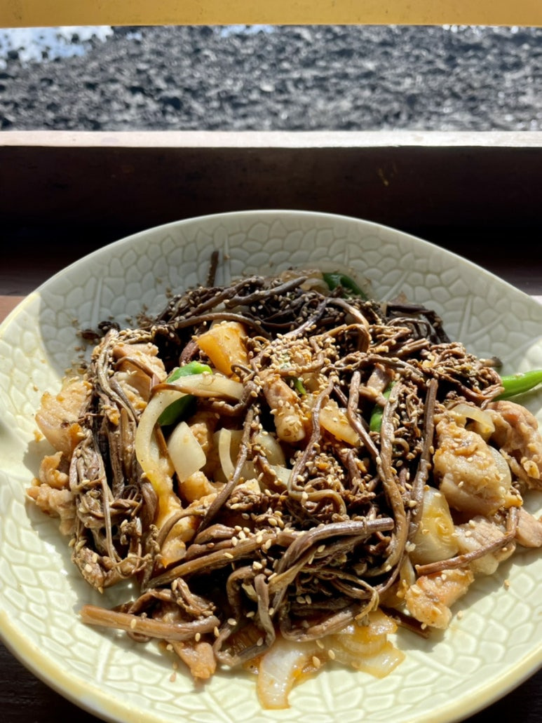 함께 소개된 고사리 두루치기 또한 올레 할망집을 대표하는 인기 메뉴입니다. 제주 특산 흑돼지고기와 고사리를 아낌없이 넣고 된장과 간장을 기본으로 한 양념에 볶아낸 두루치기는 과하지 않은 단짠의 조화가 인상적입니다.