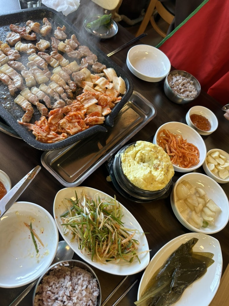 오리 백숙 외에도 제주 백돼지 초벌구이 메뉴는 고기 좋아하시는 분들께 큰 호응을 얻고 있습니다. 참숯으로 초벌한 제주산 돼지고기는 육즙이 풍부하면서도 고소한 맛이 살아 있어, 폭탄 계란찜과 함께 즐기면 남녀노소 모두 만족하실 수 있습니다.