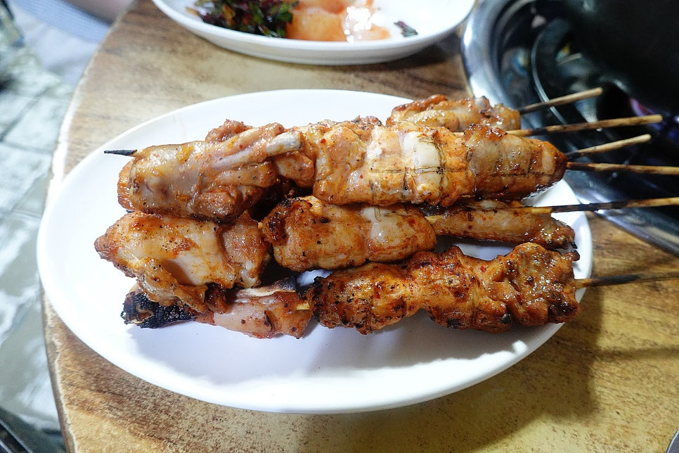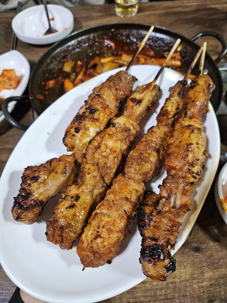이 집의 또 다른 숨은 주인공은 바로 닭꼬치입니다. 일반적인 순살 닭꼬치가 아닌, 직접 손질한 뼈 있는 닭을 직화로 구워내 깊은 불맛이 살아 있습니다. 1인당 2개까지만 주문이 가능할 만큼 귀한 메뉴로, 닭볶음탕을 기다리는 동안 곁들이기에도 좋고 단독으로 즐기기에도 손색이 없습니다.