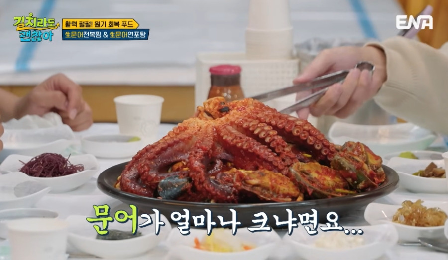 바다를 곁에 둔 속초에서 첫날 저녁 메뉴로 등장한 생문어전복찜은 화면을 가득 채울 만큼 압도적인 비주얼로 시선을 사로잡았습니다. 커다란 생문어가 통째로 올라가 있고, 윤기 도는 전복이 푸짐하게 담겨 있어 보기만 해도 바다의 기운이 그대로 전해졌습니다.