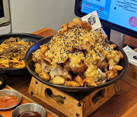 이곳의 대표 메뉴인 산더미 마늘족발은 이름 그대로 족발 위에 구운 통마늘이 산처럼 쌓여 나오는 것이 가장 큰 특징입니다.