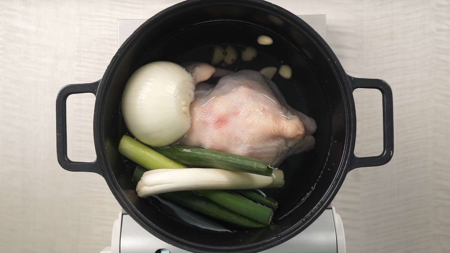 이때 마늘과 대파 뿌리를 함께 넣어주시면 닭 특유의 냄새가 사라지고 국물이 한결 부드러워집니다.