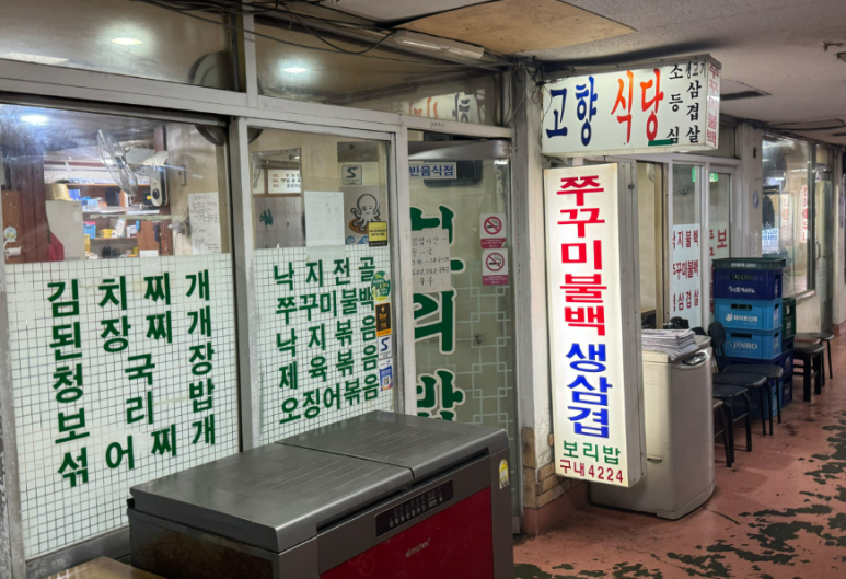 겉보기엔 투박하지만 점심시간이 되면 자연스레 사람들이 모여들고, 낙지볶음 냄새가 식당가 전체를 채우며 발길을 붙잡습니다.