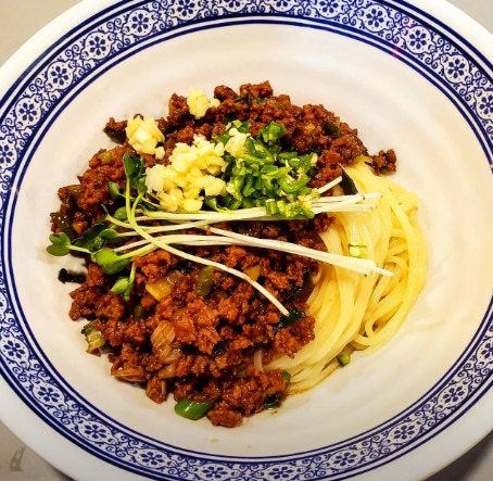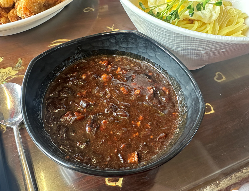 황장은 콩의 고소함이 전면에 드러나는 재료로, 짜장 특유의 달고 진한 맛과는 달리 부드럽고 담백한 인상을 남깁니다. 여기에 다진 돼지고기를 넉넉하게 볶아 올려 고기의 풍미를 살리고, 고춧가루와 마늘, 마늘쫑을 더해 은근한 매콤함을 더합니다.
