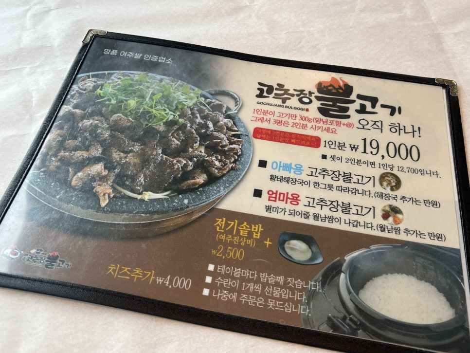 여주고추장불고기의 또 다른 매력은 손님 취향을 세심하게 고려한 서비스 구성입니다. 같은 고추장 불고기라도 선택에 따라 전혀 다른 즐거움을 느낄 수 있도록 ‘아빠용’과 ‘엄마용’으로 메뉴를 나눈 점이 인상적이었습니다.