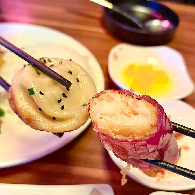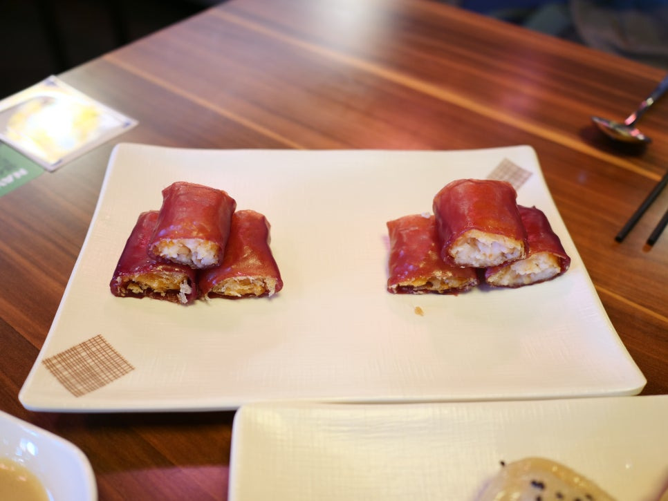 여기에 바삭하게 튀겨낸 새우를 속재료로 넣어 김밥처럼 말아낸 형태는 기존 딤섬의 틀을 과감하게 깬 창의적인 구성입니다.
