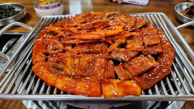 이곳의 대표 메뉴인 황태석쇠구이는 손질한 황태에 특제 양념을 입혀 석쇠 위에서 직화로 구워내는 방식으로 완성됩니다. 불 위에서 천천히 구워지는 동안 황태 특유의 고소한 향과 함께 은은한 불맛이 더해져 식욕을 자극합니다.