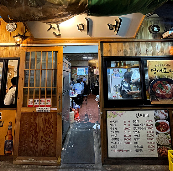 문을 열고 들어서면 테이블 사이로 오가는 손님들의 대화 소리와 주방에서 들려오는 조리 소리가 어우러져, 살아 있는 시장의 온기를 그대로 전해줍니다.