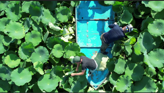 향이 가장 진하고 질 좋은 연잎을 한 장 한 장 신중하게 채취한다.