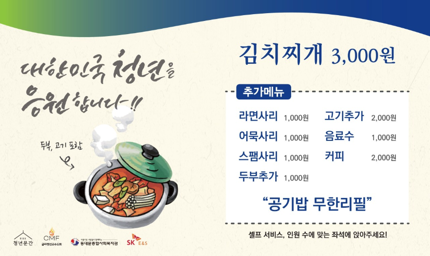 1. 청년밥상문간 슬로우점 – 3,000원 김치찌개