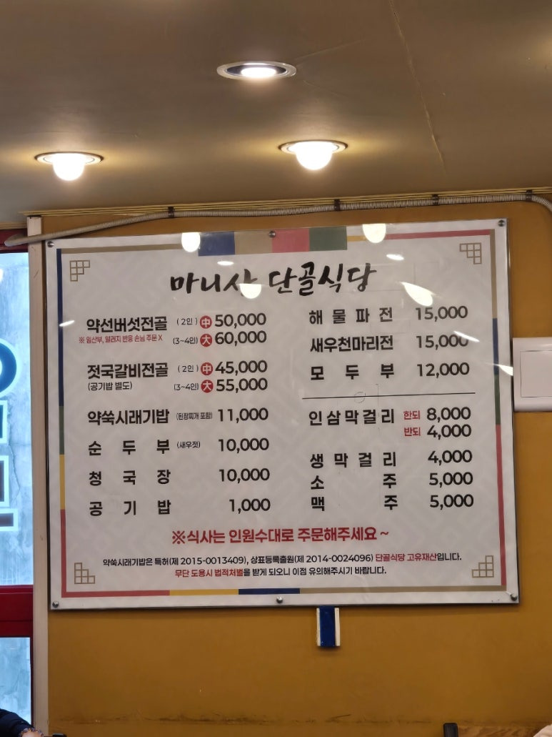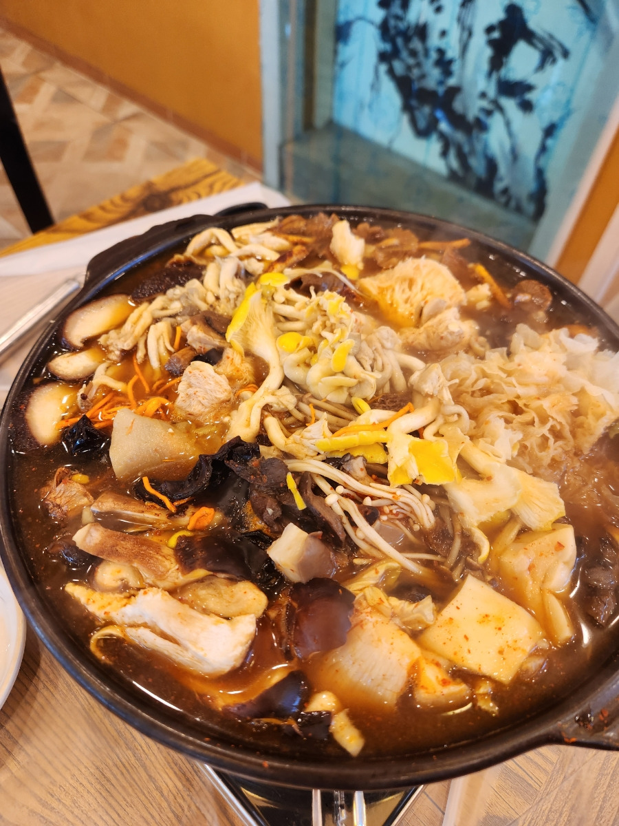 이곳의 대표 메뉴는 30가지 이상의 버섯이 들어가는 약선버섯전골과 강화 향토음식인 젓국갈비전골입니다.