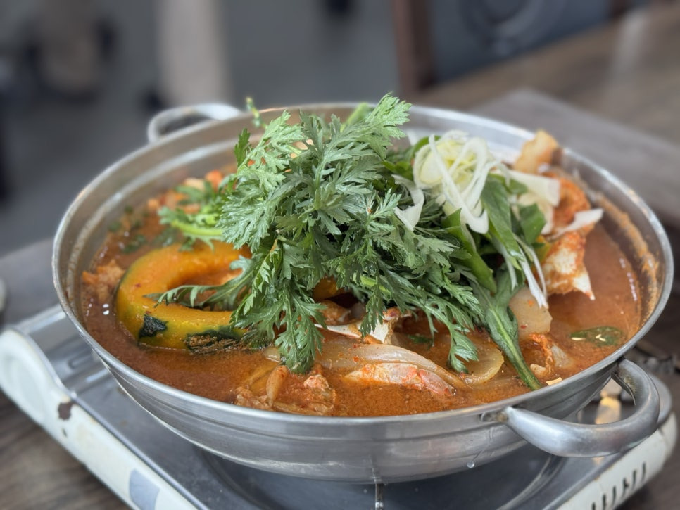 국물은 칼칼함보다는 부드럽고 진한 감칠맛이 중심을 이루며, 꽃게의 단맛이 자연스럽게 배어 있습니다. 큼직한 꽃게와 단호박, 버섯, 채소가 어우러져 맛과 식감의 균형이 뛰어납니다.
