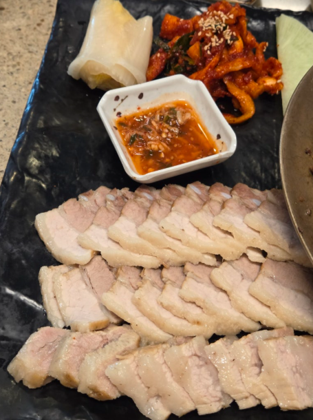 잡내 없이 삶아낸 돼지고기를 김치·무말랭이와 함께 먹으면 담백하고 깔끔하다.