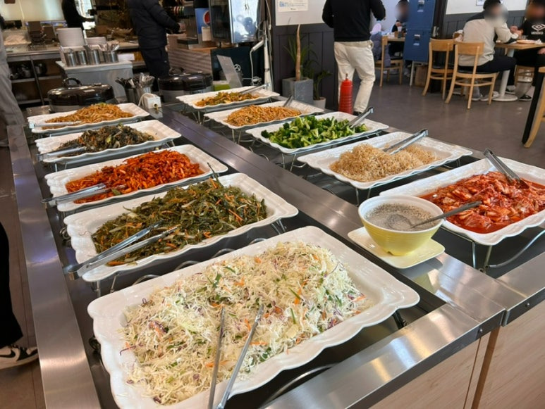 나물과 무침, 볶음류는 기본이고, 제육볶음과 떡갈비 같은 인기 메뉴도 넉넉히 제공되어 남녀노소 누구나 만족할 수 있는 구성이 돋보입니다. 또한 비빔밥 코너가 따로 마련되어 있어 여러 나물을 취향대로 담아 고추장과 함께 비벼 먹는 재미도 느낄 수 있습니다.