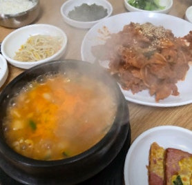 늙은 호박을 넣어 끓여낸 청국장과 된장찌개는 구수하면서도 달큰해 주물럭과 훌륭한 균형을 이루며, 아홉 가지 밑반찬은 매일 아침 직접 만들어 정갈하고 깔끔한 맛을 자랑합니다.