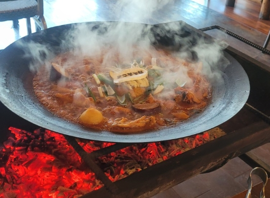 이곳은 장작불 위 커다란 무쇠 솥뚜껑에서 토종닭을 조리해 내는 방식으로,