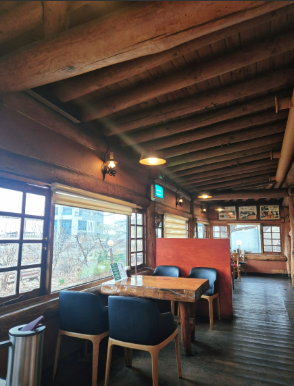실내는 전통 한옥 느낌의 인테리어이며, 테이블 간격도 넉넉합니다.