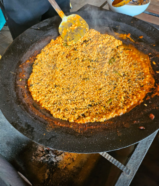 : 솥뚜껑 위에서 장작불로 조리된 닭고기는