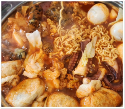 떡과 어묵, 김말이, 유부주머니, 양배추, 삶은 계란 등 다양한 재료가 풍성하게 들어가 있으며, 매콤하면서도 깔끔한 국물이 특징입니다. 자극적인 매운맛이 아니라 자연 재료로 우려낸 깊은 맛의 양념이기 때문에 부담 없이 즐길 수 있고, 문어 특유의 쫄깃한 식감과 어우러지며 특별한 풍미를 완성합니다.