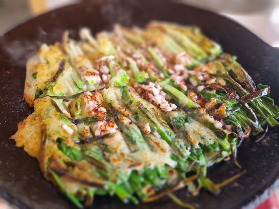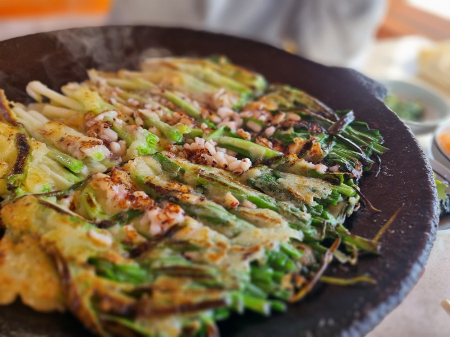 한입 베어 물면 쪽파의 달큰함과 해산물의 감칠맛이 입안 가득 퍼지며, 기름지지 않고 깔끔한 여운이 남는 것이 특징입니다.