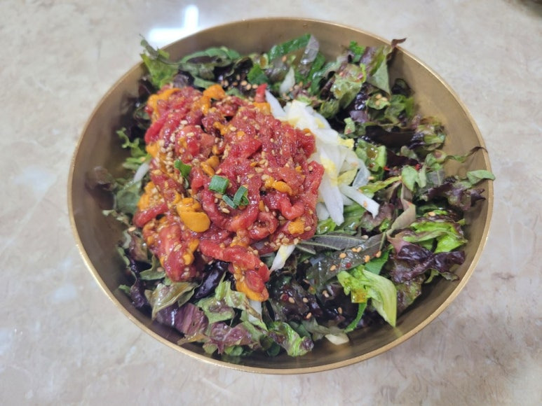 멍게육회비빔밥은 신선한 육회와 멍게를 준비해 고추장 양념과 채소를 더해 비비면 바다 향과 고기의 풍미를 동시에 느낄 수 있습니다.
