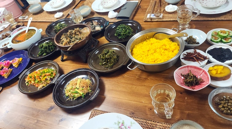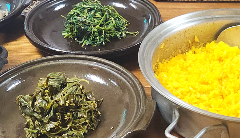 밥상 위에는 제철 나물과 장아찌, 강황밥을 비롯해 무려 27가지 반찬이 정갈하게 놓입니다. 얼핏 양이 적어 보이지만, 다양한 가짓수가 모여 어느새 배가 든든히 채워집니다.