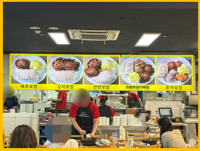 이 집의 대표 메뉴는 반반보쌈으로, 김치보쌈과 배추보쌈을 한 번에 즐길 수 있는 구성이며, 계절에 따라 굴보쌈도 선택할 수 있습니다.